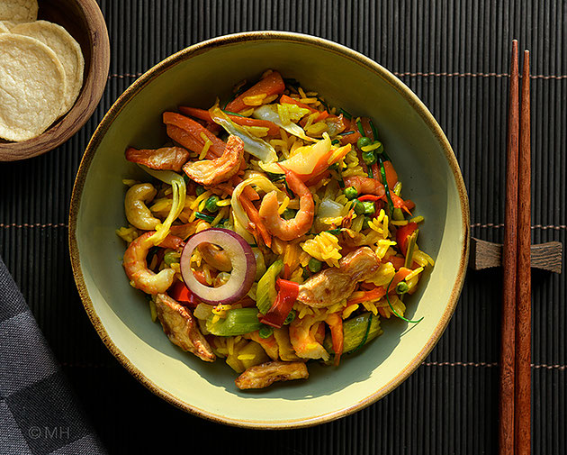 eine Portion würzig-scharfes Nasi Goreng mit Huhn, vielerlei Gemüsen und einigen frühmorgens gefischten Garnelen.